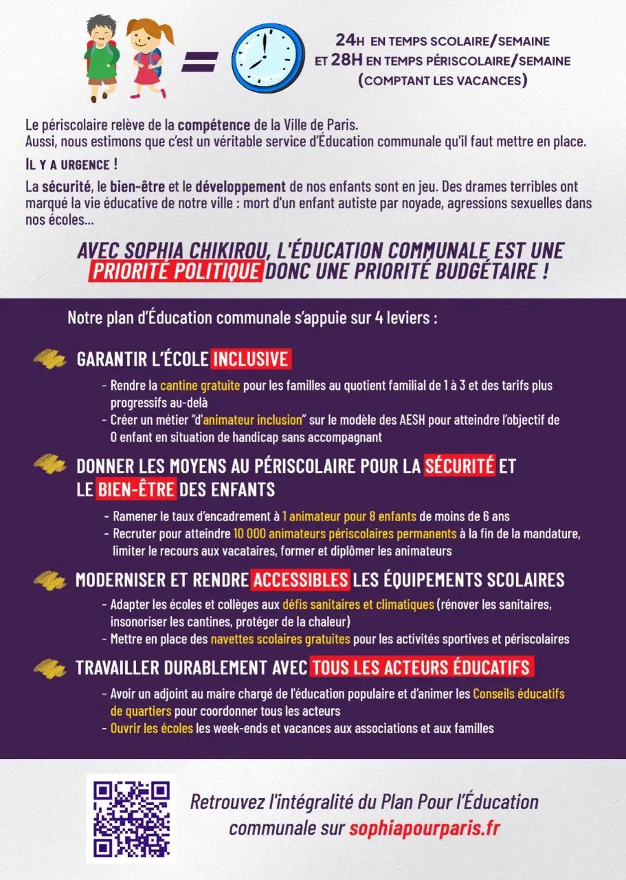 Le Nouveau Paris Populaire propose un véritable service d’Éducation Communale, comme il y a une Éducation nationale. Il n’y a pas un enfant du temps scolaire et un enfant du soir ou du mercredi : il y a un enfant, vivant d’un seul tenant et se construisant comme personne. Nous nous fixons un objectif politique : la sécurité, le développement et le bien-être des enfants, grâce à des personnels formés, fidélisés, reconnus, bénéficiant d’un vrai déroulement de carrière.